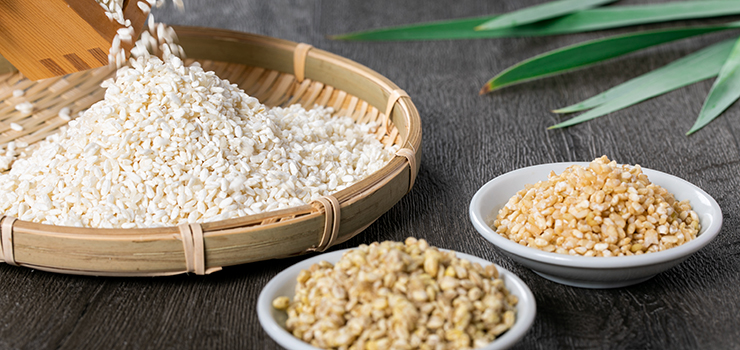 古代のころより糀を醸造させて、酒、味噌、醤油、酢、甘酒など様々な食品や調味料が産み出されました。糀は日本の発酵食の根幹といえます。